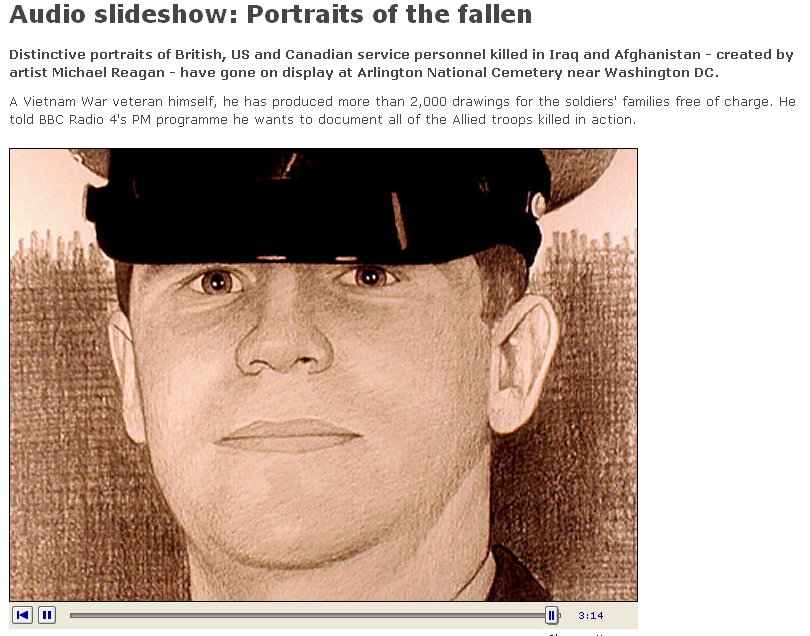 As well as excellent use of music and natural sound, this slideshow stands out because of the wonderful use of split screens to tell the story. The narrative itself is very simple, with the artist, Michael Reagan,telling three stories of killed soldiers he has drawn.