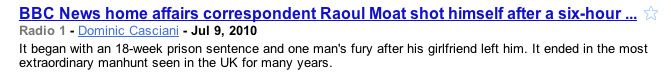 The secret life of a BBC home affairs correspondent… July 15, 2010 Written by David White Something not quite right here…screen grab from Google news… Leave a Reply Cancel replyYour email address will not be published. Required fields are marked *Comment * Name * Email * Website Δ This site uses Akismet to reduce spam. Learn how your comment data is processed.