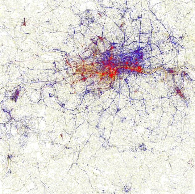 Written by David WhiteStrangely beautiful and fascinating too…maps showing where locals take pics vs where tourists do…via geotagging…below shows London..blue signifies locals taking pics, red = tourists. View the other cities. Fabulous.