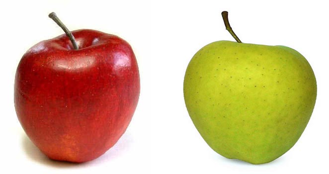 Close your left eye, and look at the green apple. Then close your right eye, and look at the red apple. That was a warming up exercise. Now, make yourself go crosseyed, marvel at the crapness of my experiment, and go out and take some pictures.