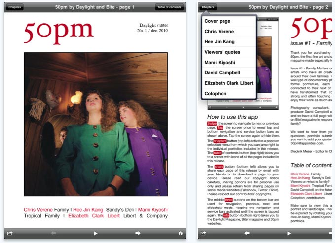 A. Our first issue – Family Matters – has been released in app stores worldwide on December 7. It comprises beautiful portfolios by Chris Verene, Hee Jin Kang, Mami Kiyoshi and Elizabeth Clark Libert, four artists who share inside views of their own families. It covers American family life of various social classes and a Japanese family set against a recreation of paradise. Each of these artists has connected with their family to create a beautiful, strong and often touching photo story.