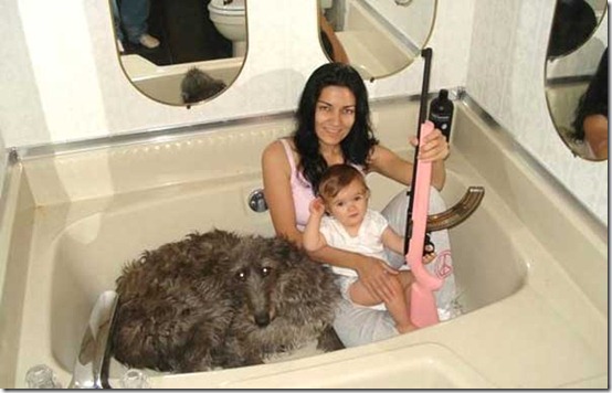 Written by David WhiteI went looking for pics of pink ak-47’s. They are out there, and someone should do a story on them. In the meanwhile, I got distracted by this pic, from here. I really don’t know what the oddest part of this pic is…the bath, the gun, the dog, the baby, or the woman’s cnd emblem on her trousers. You decide. I’m sure there’s a plausible explanation for it all. Somewhere.