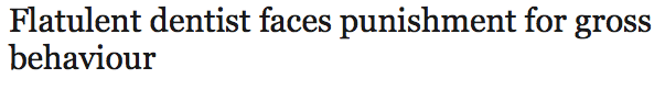 #ff – flatulent friday March 4, 2011 Written by Ciara Leeming – aka Headline of the week Discussion (2 Comments) Lisa Hogben says: March 6, 2011 at 02:35 Ciara where do you get this stuff? Reply ciara says: March 6, 2011 at 09:47 saw this on Twitter. dirty man Reply Leave a Reply Cancel replyYour email address will not be published. Required fields are marked *Comment * Name * Email * Website Δ This site uses Akismet to reduce spam. Learn how your comment data is processed.