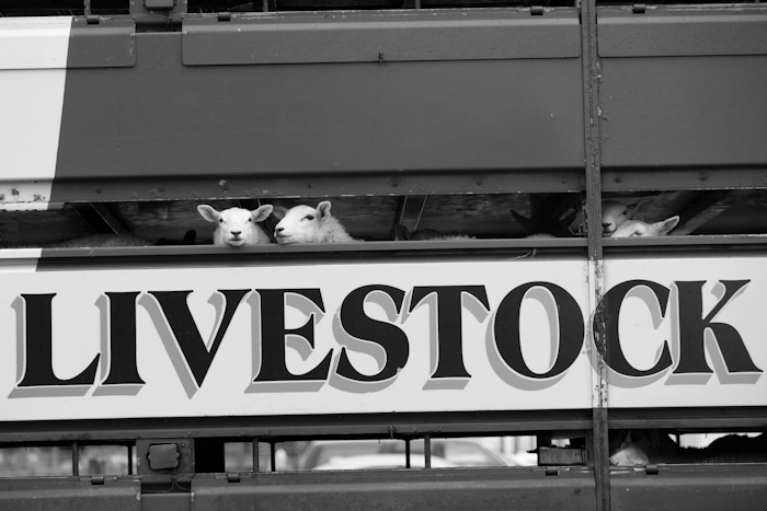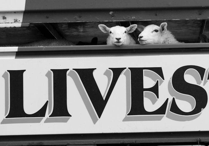 And I immediately spotted a lovely ‘sign’ that would make a perfect opening image. The trailer had ‘livestock’ emblazoned along the side, but I realized that judicious cropping would reduce this to ‘lives’, and it just required me to wait until a sheep or two peeked out to see what was happening, and I’d maybe get the shot. So I waited. And they did.