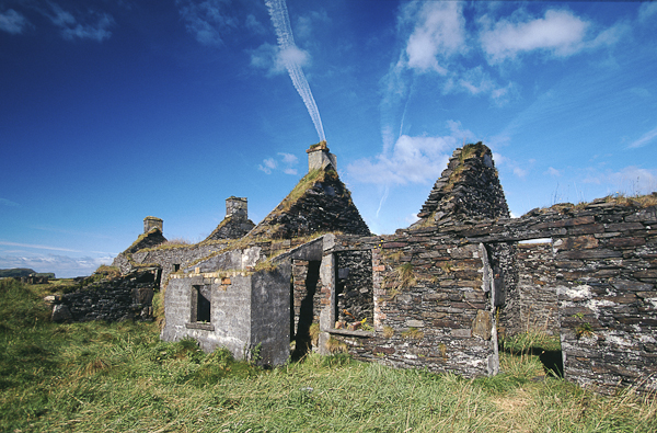 Ruined cottage and jet vapour trail, Belnahua. © John MacPherson