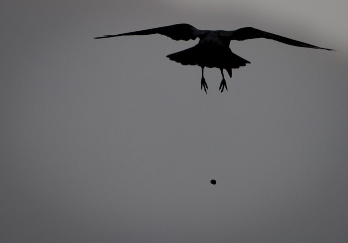I watched this crow lift whelk shells on the seashore and drop them to smash them open, revealing the tasty morsel inside.