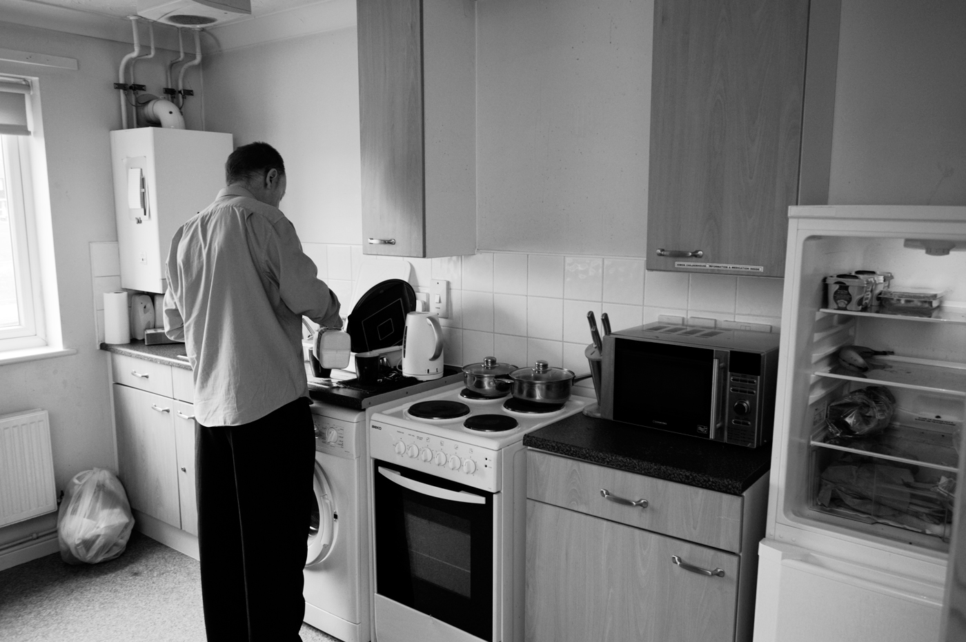 Simon making a coffee at home after his morning shift as a Carer for the elderly. A job he loves.