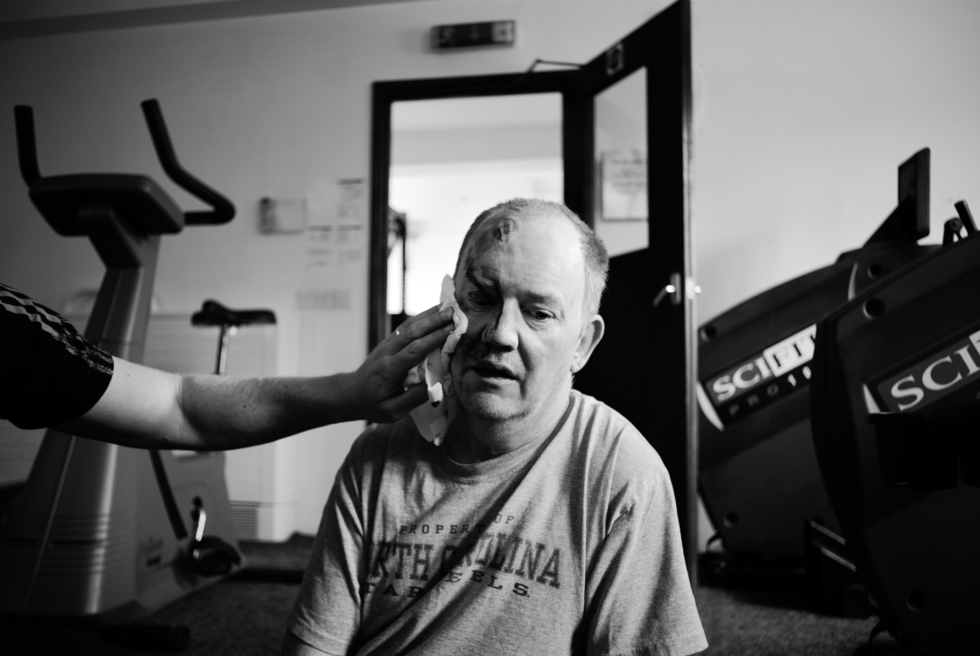A spilt second later he regained consciousness and the extent of the injury he had sustained whilst falling became apparent. He’d suffered a deep laceration to his forehead and his cheekbone. Both were swelling up and bleeding profusely.