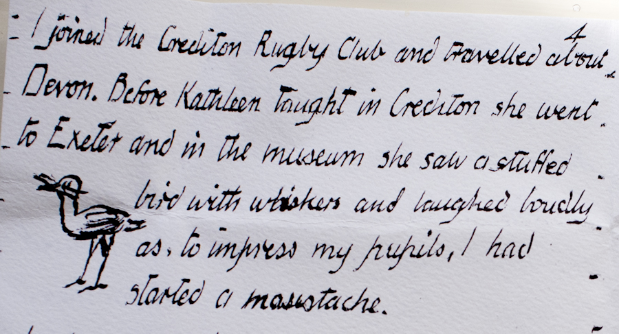 Eventually we obtained a flat in Searle St.I joined the Crediton Rugby Club and travelled about Devon. Before Kathleen taught in Crediton she went to Exeter and in the museum she saw a stuffed bird with whiskers and laughed loudly, as, to impress my pupils I had started a moustache.