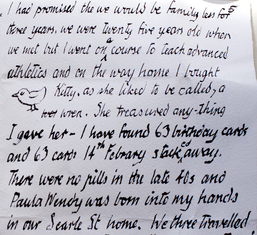 I had promised that we would be family less for three years. We were twenty five years old when we met but I went on a course to teach advanced athletics and on the way home I bought Kitty, as she liked to be called, a wren. She treasured anything I gave her – I have found 63 birthday cards and 63 cards 14th February stacked away . There were no pills in the late 40’s and Paula Wendy was born into my hands in our Searle St home.