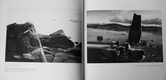 Its worth noting the image selection and layout of ‘Pattern of the Hebrides’. I have no idea if it was Wylie’s or the graphic designer’s choice, but there’s ‘poetry’ in the way the images lead you through the pages: an ammonite fossil on the left page on a slanting rock is ‘balanced’ on the facing page by a perfectly tilted monolith, the MacLeod Stone, surrounded by sheep, the curl of the ammonite echoing the curl of sheep horn, but the message seems to be ‘this may be an old landscape, with aspects of its past ‘fixed’ in stone and forever immutable, and like sheep we are destined to follow each other by our births in this place, but not blindly so, because we can make our marks in various unique ways’.