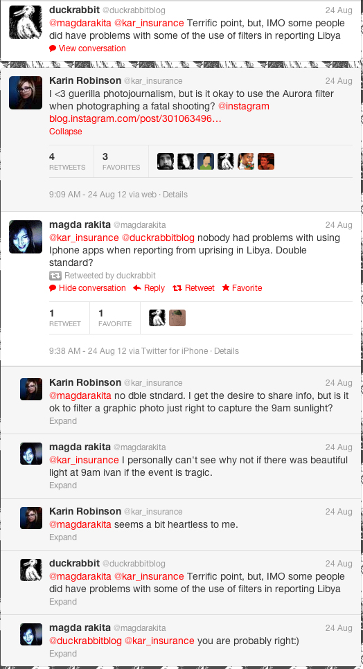 Not being acquainted with Instagram I didn’t notice there was anything ‘odd’ about any of the images in question, nor that there was a possibility that one had perhaps been enhanced with an ‘aurora’ filter. I just saw pictures of a happening event in quite nice light, as recorded by bystanders, the ‘citizen journalists’ that mobile digital technology has transformed us all into. So here was a debate about the ‘appropriateness’ of instagram/filters on such an image. And asking the question: did the filter make the image too beautiful? Perhaps, but only if you knew it was a filter. What if the natural light was in reality quite stunning, a glorious dawn spilling across the scene? Was that somehow “too nice”?