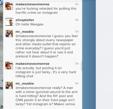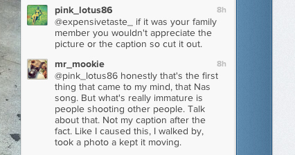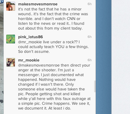 I then read the responses to mr_mookie’s instagram image of the shooting scene with an injured person lying in the street, and the polarized opinions being expressed over this picture and his caption. Several comments were directed specifically at mr_mookie’s caption:
