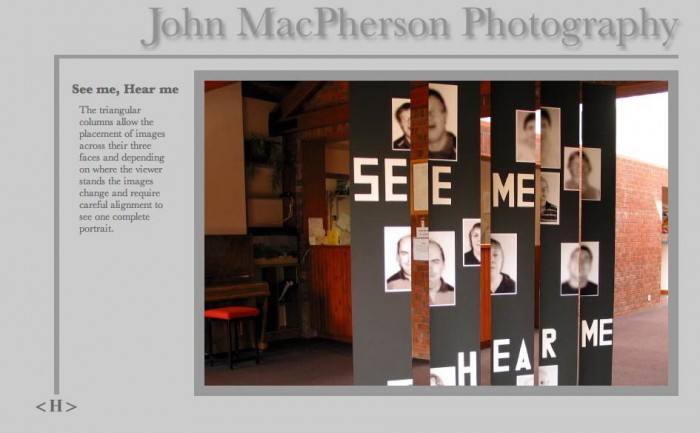“This piece of work is designed to challenge the viewer. The series of aligned triangular columns present a variety of sides when viewed from different angles. By splitting a series of images across these sides, and varying the sizes of the two halves of the images, it forces viewers to have to find the appropriate perspective to view one individual portrait as a cohesive ‘whole’.