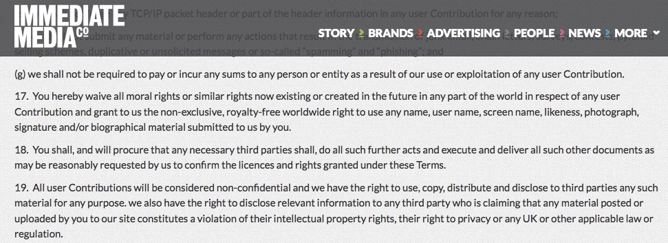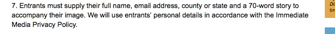 The ‘Your Photos Terms & Conditions’ for the competition (here) makes no mention of the potentially more draconian Immediate Media Co. Terms and Conditions (which are here). But the page on which the Your Photos competition T&C’s are written has at page bottom (here) a link directly to the Immediate Co’s T&C’s page which makes it quite clear that anything submitted through their site is subject to the far more comprehensive terms hidden in the background. Which set of T&C’s take precedence is anyone’s guess. And by using their service you agree that the T&C’s may be amended whenever Immediate wish, and you’ll be bound by the changes, but if its the ‘hidden’ terms only that are amended, how will that affect users if the more visible terms on the competition page are not amended?