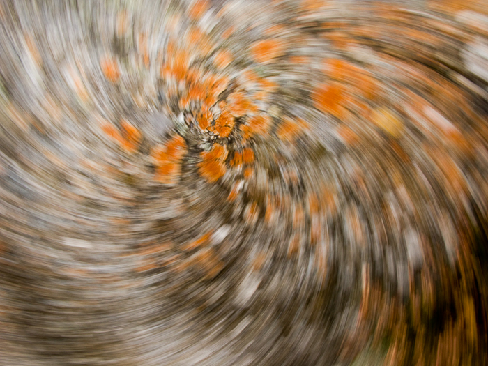 Trying to entertain a cold wet group on a miserable day prompted some experimentation with a compact camera, twirling it as it was moved in towards the boulder…