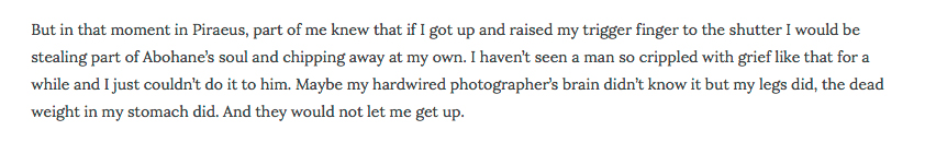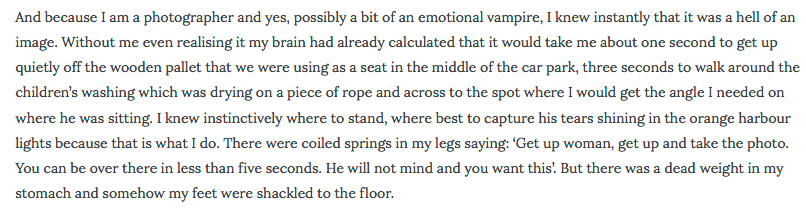 “Perhaps it is that that I could not photograph, my own guilt that I could not look at and record, reflected back at me in his tear-flooded face. It is the photograph of that, that I could not take and it will haunt me forever.” Mary Turner, 2016