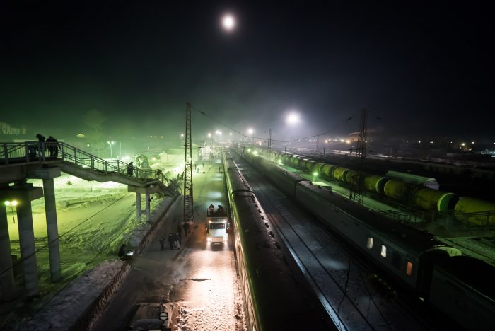 The green tint of the floodlights transforms the smoke rising from the ancient coal burners in the carriages. A jade mist hangs over us. I look up and down the platform. Only a few have taken the opportunity to stretch their legs and escape the stuffiness of the 4-berth cabins. Sucking on cigarettes as well as ‘fresh’ air.